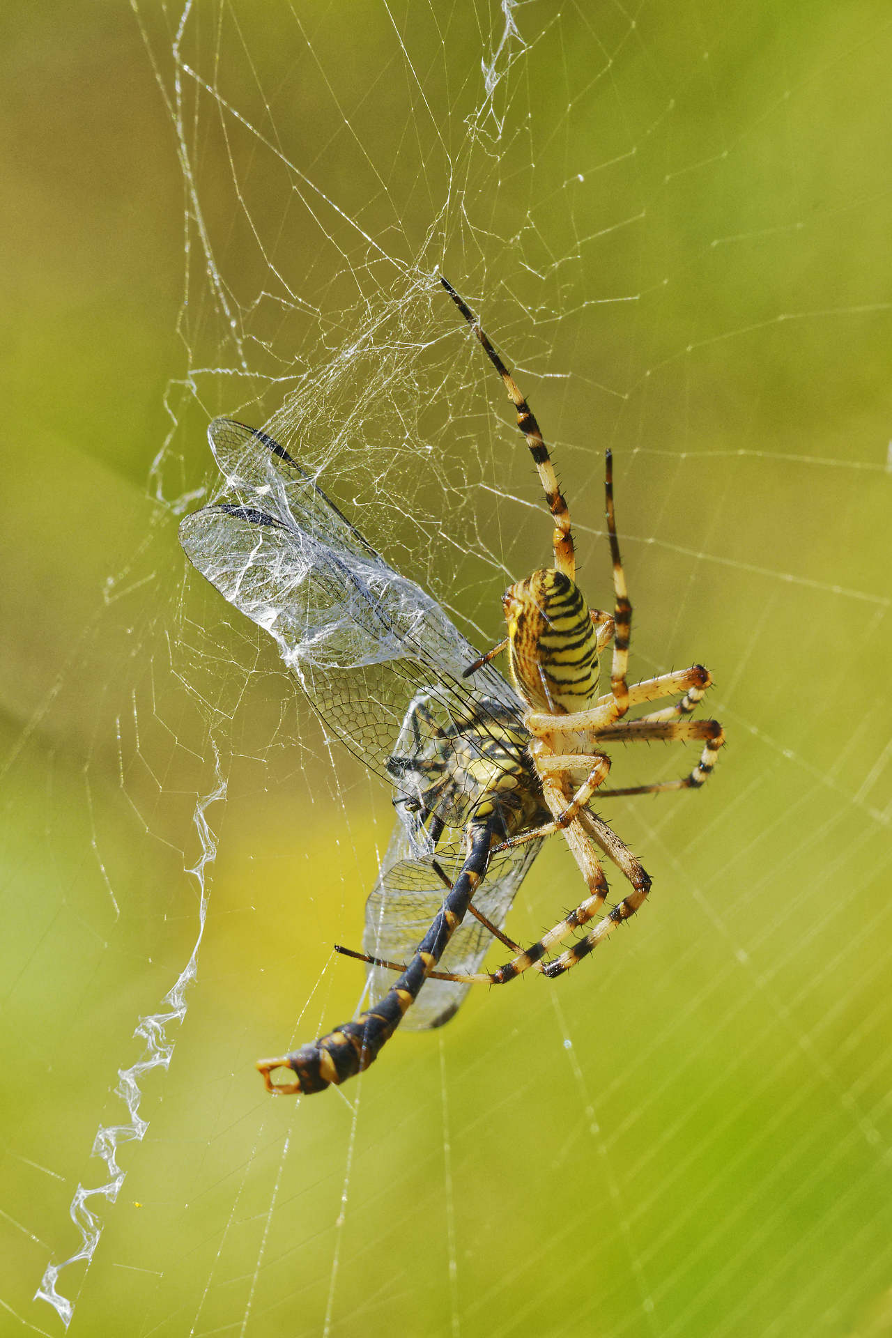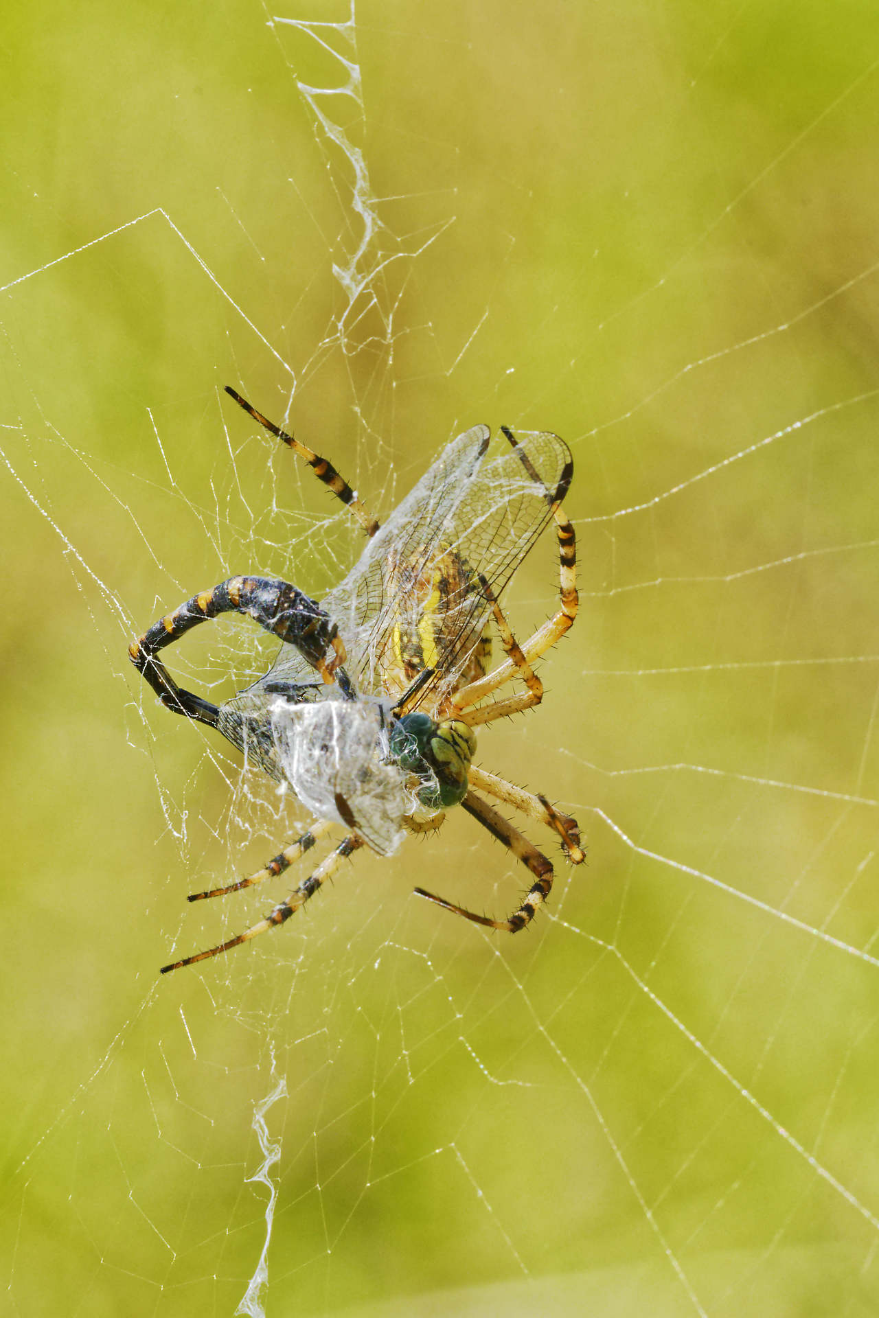 Ici, une libellule tombée dans les filets de la belle argiope, est éperonnée et emballée prestement.