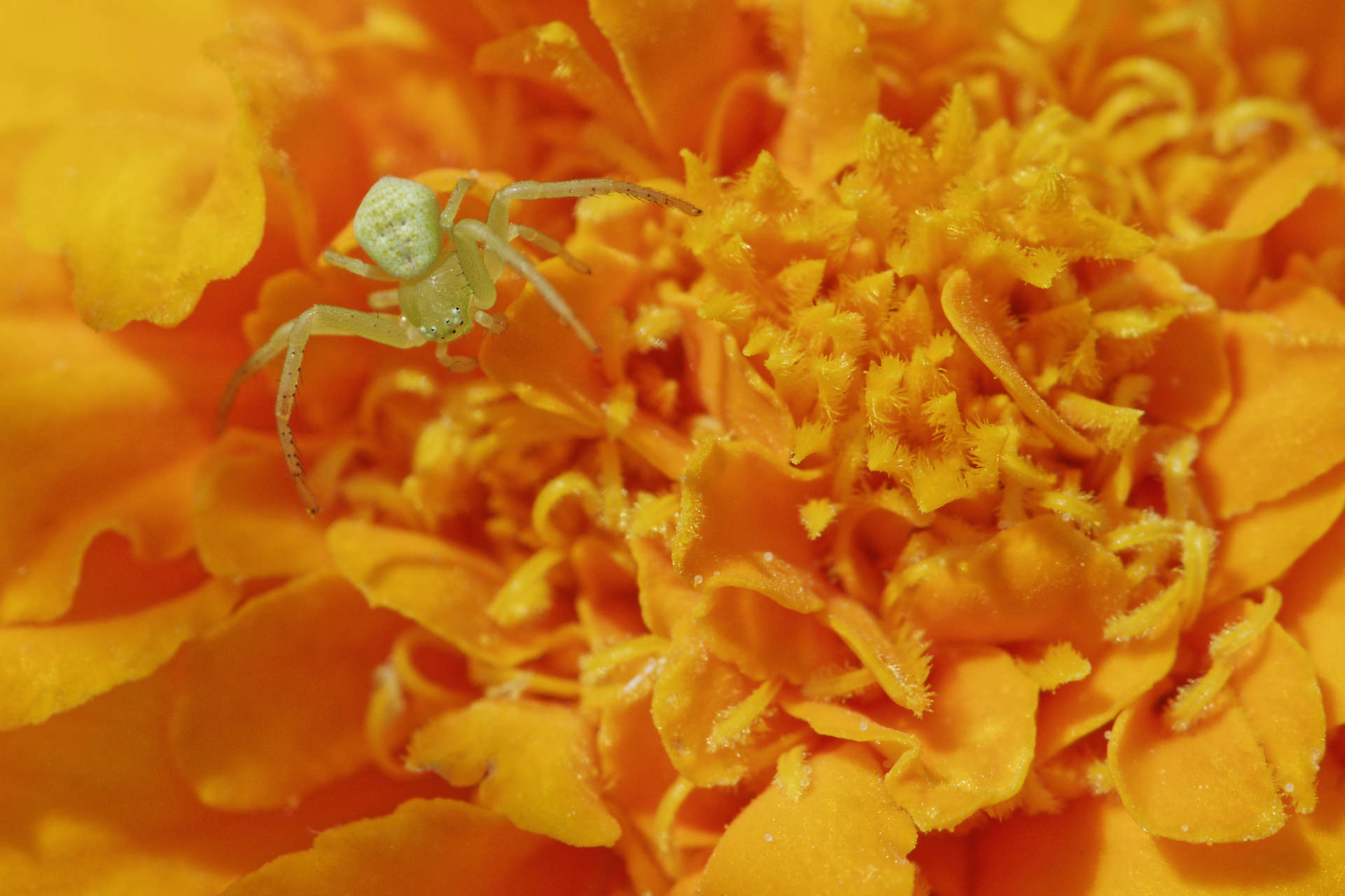 La femelle arbore la couleur du centre de la fleur sur laquelle elle s’est postée à l’affût. Ainsi camouflée, elle surveille et attend l’arrivée d’une proie. Adulte, telle un caméléon, elle modifie sa couleur pour se confondre avec les fleurs jaunes et blanches. Cela lui prend de plusieurs heures à plusieurs jours…