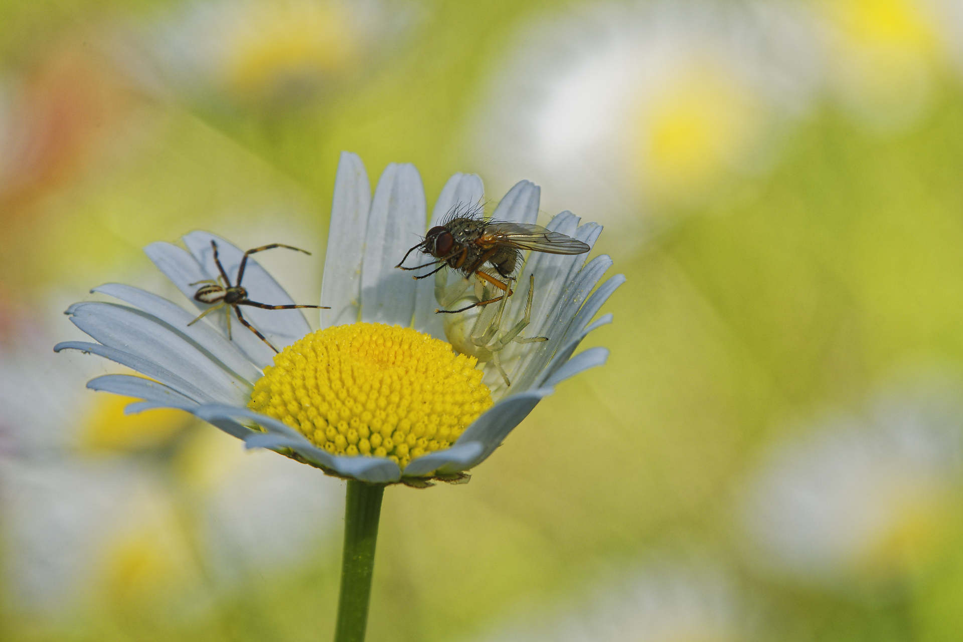 L’araignée-crabe femelle a attrapé la mouche avec ses pattes antérieures. Elle lui a injecté du venin pour la paralyser. La mouche n’est pas parvenue à s’échapper !